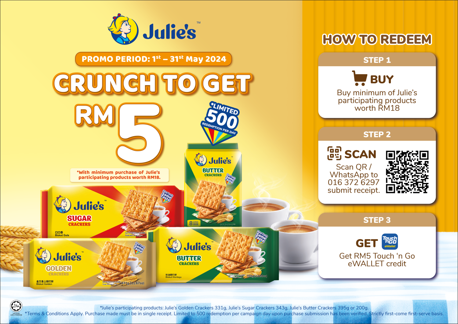 - Program Penebusan Julie’s ‘CRUNCH TO GET’ [“Penebusan”] adalah dianjurkan oleh Julie's Marketing Sdn. Bhd. ["Pihak Penganjur"]. Program Penebusan ini akan bermula pada 1 Mei 2024 hingga 31 Mei 2024 ["Tempoh Penebusan"].